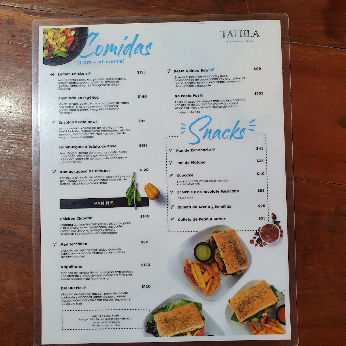 Welcome to Talula Bar Natural, a delightful culinary gem nestled in Merida, Mexico. Specializing in healthful, vibrant dishes, this eatery offers an inviting menu perfect for any meal of the day. A highlight is their exquisite Paninis. The Serrano Pesto Sandwich combines artisan sourdough with jamón serrano, organic pesto, and fresh vegetables, while the Salmon Sandwich features flavorful smoked salmon and a creamy finish for a satisfying crunch.